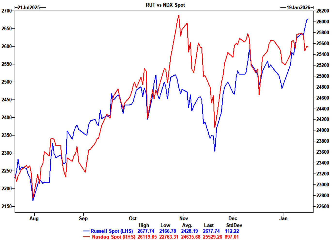- RTY has outperformed NDX by ~3% YTD; RTY outperformed SPX every day in 2026 so far (fun stat).