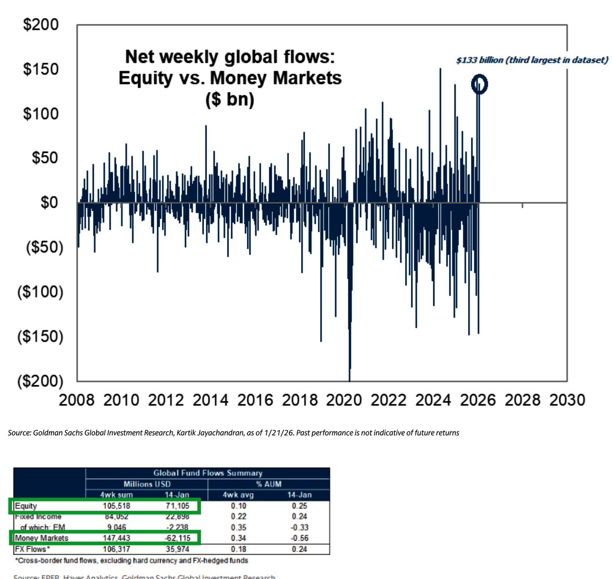 - Money market assets fell -$62bn, cited as 3rd largest in their dataset → cash is rotating out of sidelines.